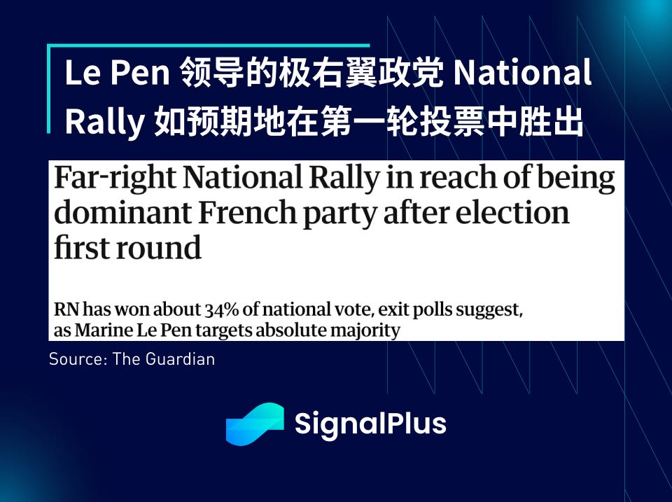 与此同时,法国选举的第一轮投票如预期由 Le Pen 的 National Rally 取得胜利,该极右翼政党赢得了 34% 的选票,有望获得多数席位。