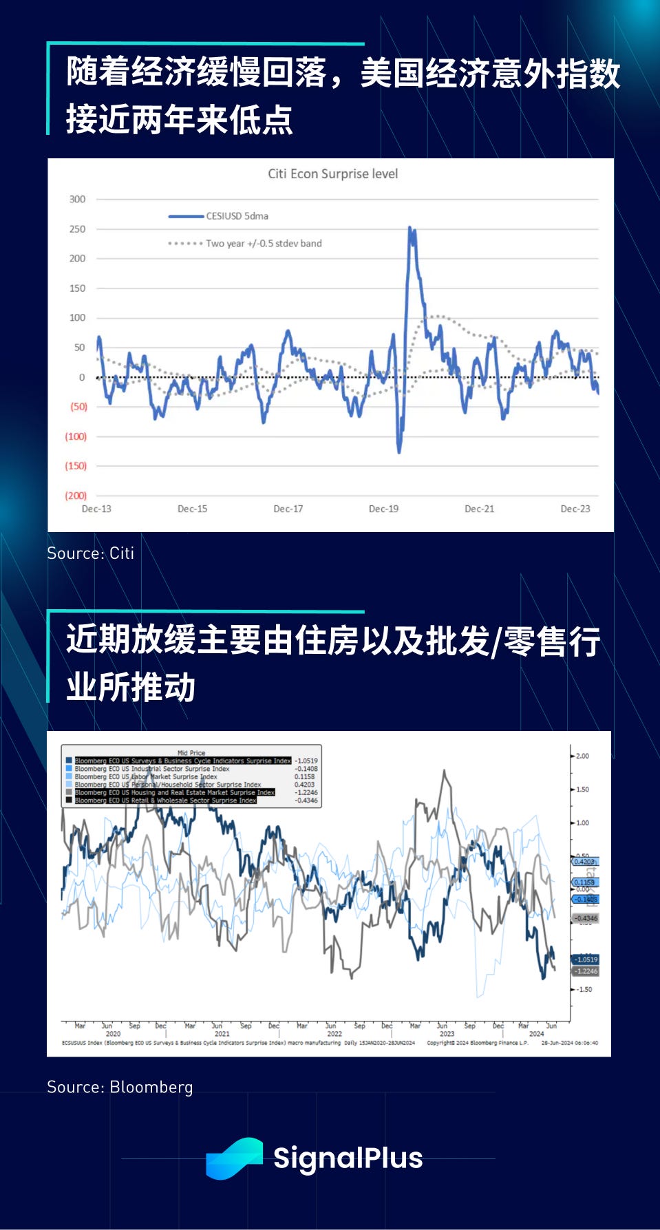 从经济数据来看,美国经济已从过去两年的高点放缓,经济意外指数跌至多年低点,高频消费者数据显示疫情期间的储蓄大幅下降,消费者债务令人担忧地增加。