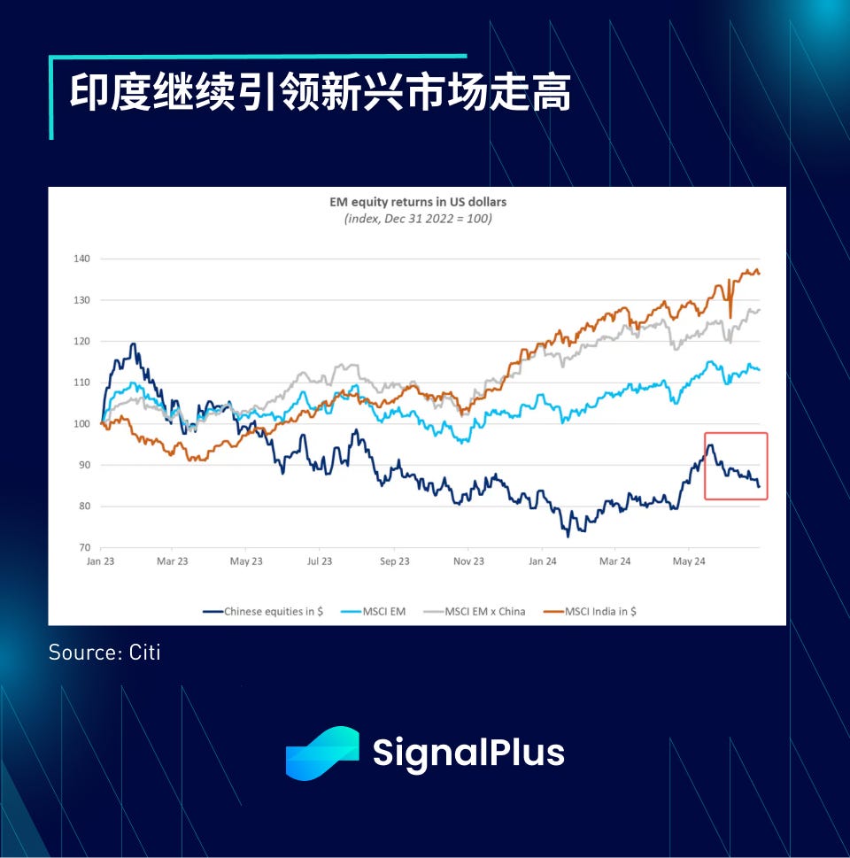 随着资本持续从中国流出,印度在新兴市场中保持领先地位。过去 1.5 年来,印度市场上涨 30% (以美元计),而中国股市则下跌了约 15% ,两者之间的表现差距达到 45% 。