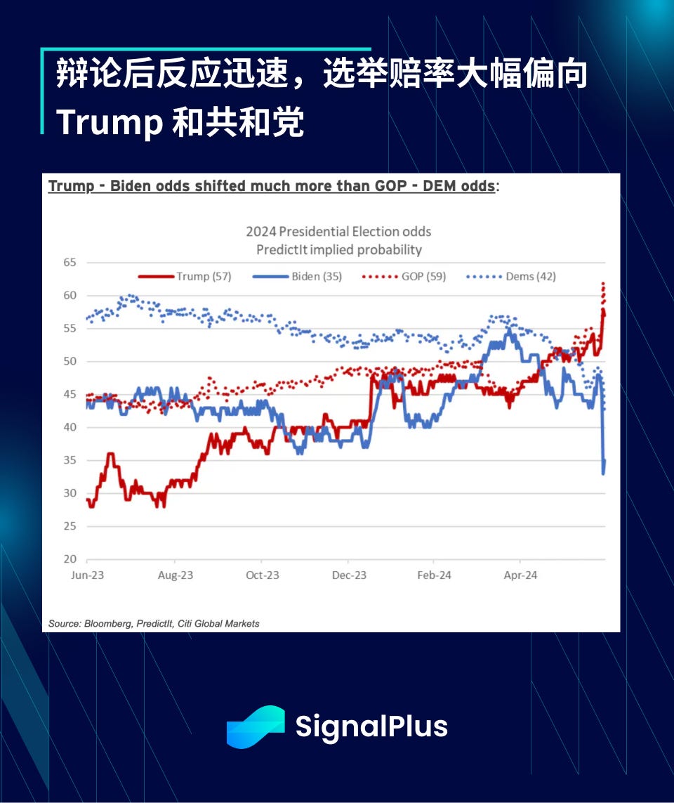 政治方面,Biden 总统在第一场总统辩论中表现不及预期,令人担忧其年龄和健康状况,另一方面,前总统 Trump 表现相对稳定(以他的标准来说),辩论后的反应迅速且显著,Trump 与 Biden 的获胜赔率差距从辩论前的 + 10 点扩大至 + 22 点。除了正面交锋之外,Biden 的胜率(35% )现在比民主党的胜率(42% )还低 7% ,而 Trump 和共和党的胜率现在大大超过 50% 。