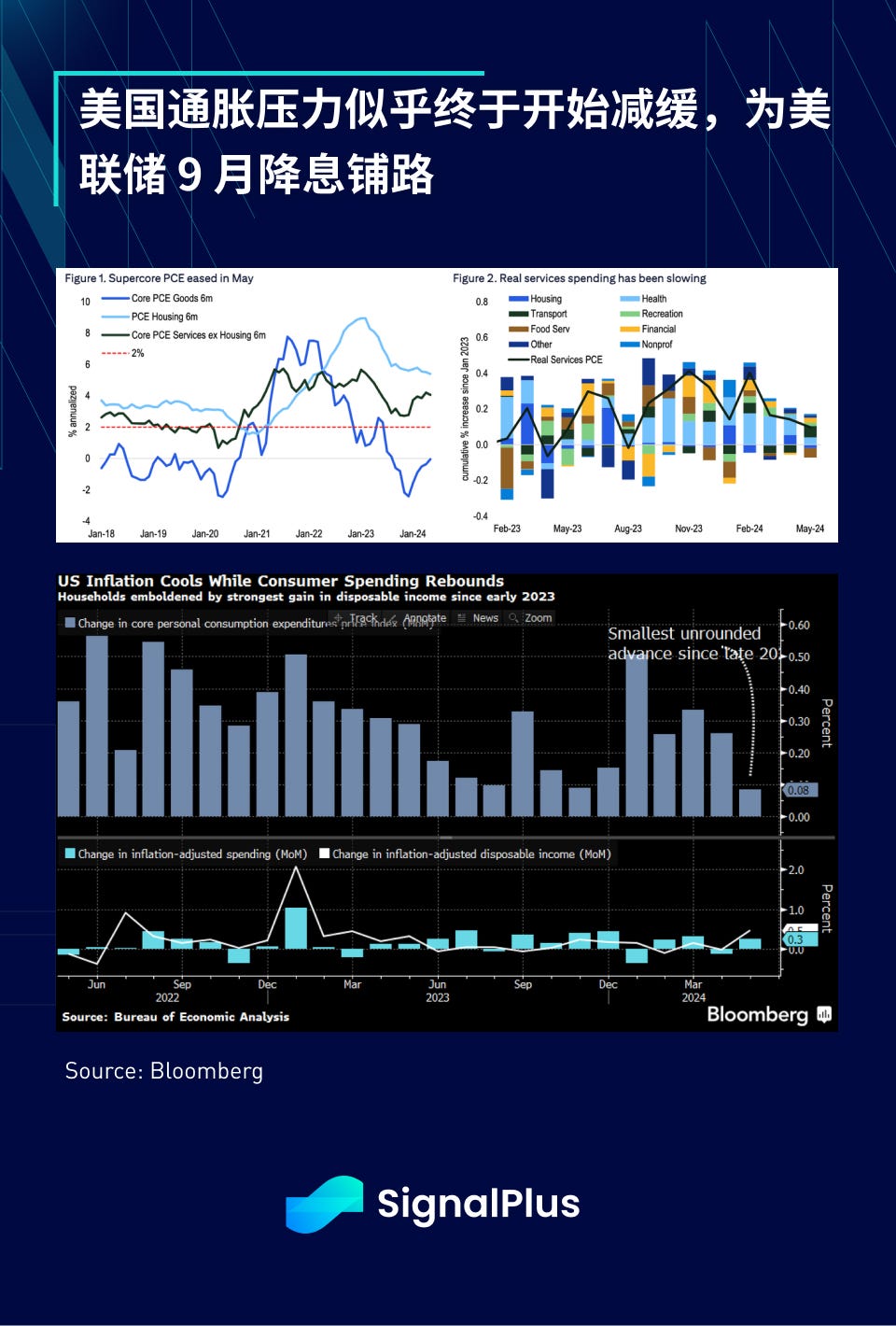 在通胀方面,价格压力在经历多次的反复失望后,似乎终于开始放缓。上周五公布的 5 月份 PCE 增长 0.08% ,低于市场预期,“超级核心” PCE 仅增长 0.1% ,有助于明确美联储可能在 9 月降息的计划。
