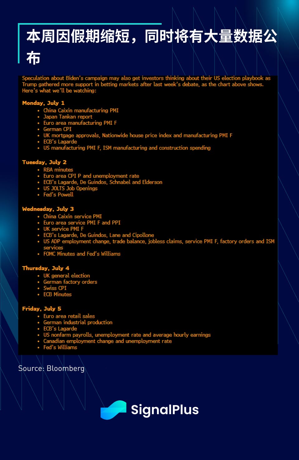 本周因假期缩短,只有 3.5 个交易日,周三将有大量数据发布,包括 ADP、失业救济人数、ISM 服务业指数和 FOMC,周四假期结束后,周五将立即公布非农就业数据,预计将非常忙碌。