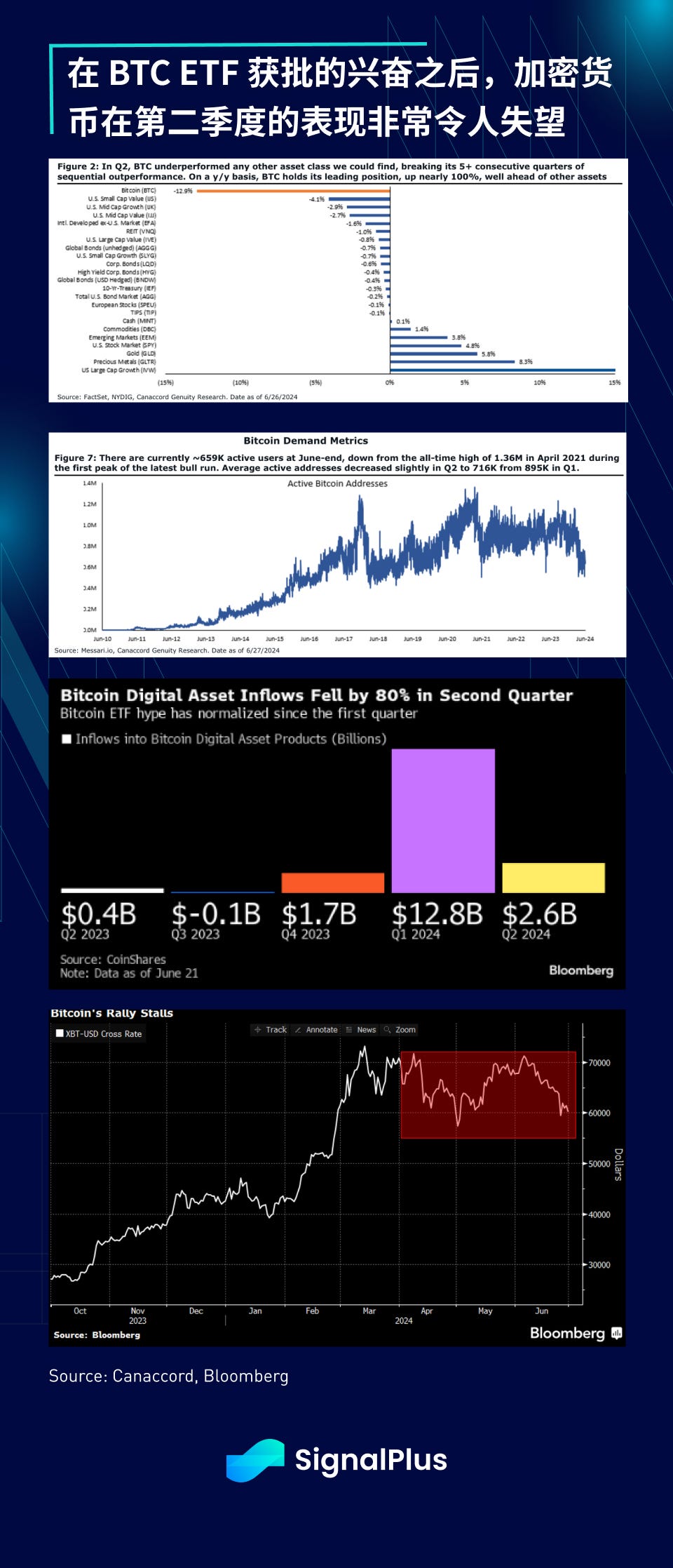 在加密货币方面,上周五结束了一个非常令人失望的季度,BTC 在第二季度下跌 13% ,资金流入减缓、缺乏实质性的主流技术创新、需求指标下降、加上供应面的隐忧,都加剧了加密货币的困境,BTC 未能突破 60–70 k 区间。