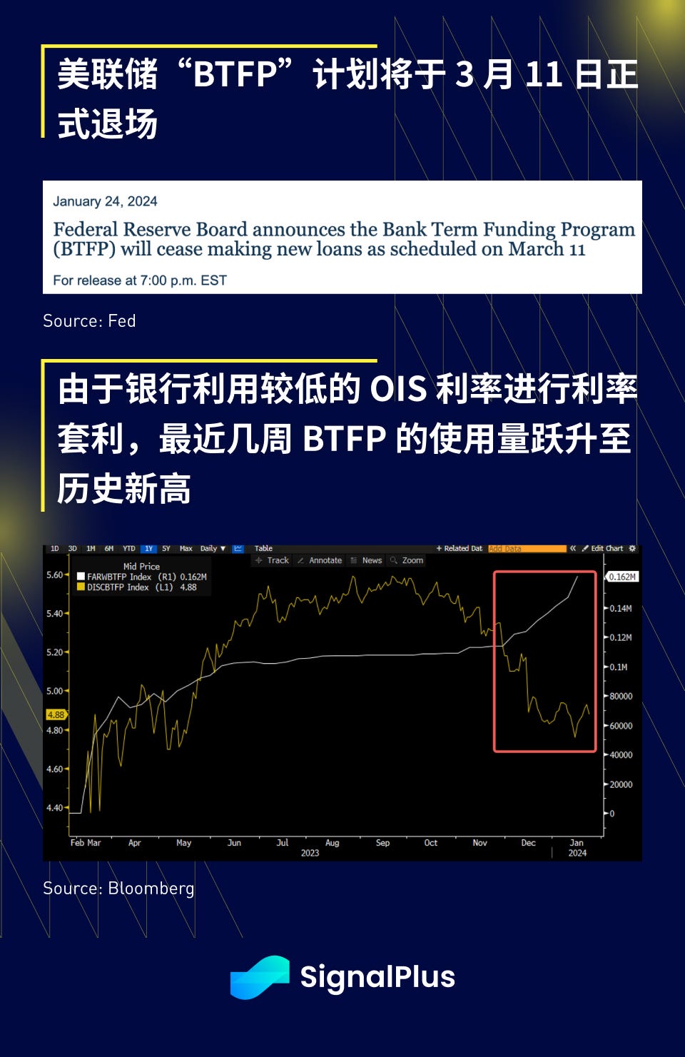 另外,聯準會宣布,去年推出的緊急借貸方案BTFP (Bank Term Funding Program) 將於3 月11 日正式到期退場,由於部分銀行趁著OIS 利率下降,自系統中藉入資金再重新存入以進行利率 套利,該計劃的使用額度最近躍升至最高點,正如一句老話所說,“千萬不要浪費一個好的危機”,投資銀行無疑是牢記這一建議的高手。
