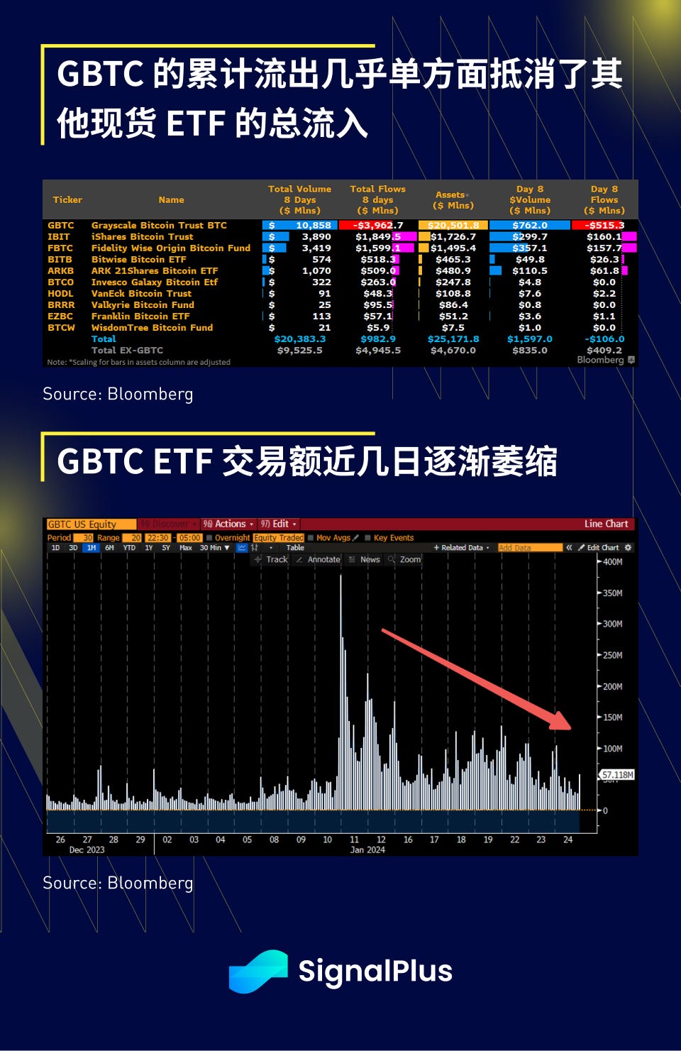 然而,市場情緒仍偏低迷,GBTC 的累計流出幾乎單方面抵消了其他9 只ETF 的總流入,此外,GBTC 的交易額(並非純粹交易量)在過去幾天一直在萎縮,BTC 期貨的未平 倉量也顯著減少,因為部分交易活動可能已經被現貨ETF 蠶食,總而言之,市場仍在持續克服短期資金外流,同時又缺乏正面激勵因素,價格在短期內可能會繼續回調。