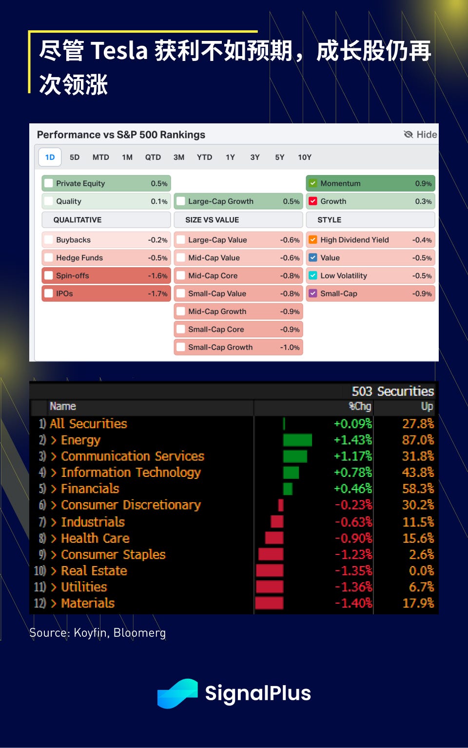 股市收盤小漲,回吐了部分中國刺激計畫帶來的早盤漲幅。 儘管Tesla 獲利不如預期,能源和大型科技股仍再次領漲,Tesla 的獲利、營收和毛利率均低於預期,該公司警告稱, 2024 年銷量成長可能會「顯著」下滑;未來兩 週將迎來財報季的高峰,恰逢月底一系列重要宏觀指標的發布。