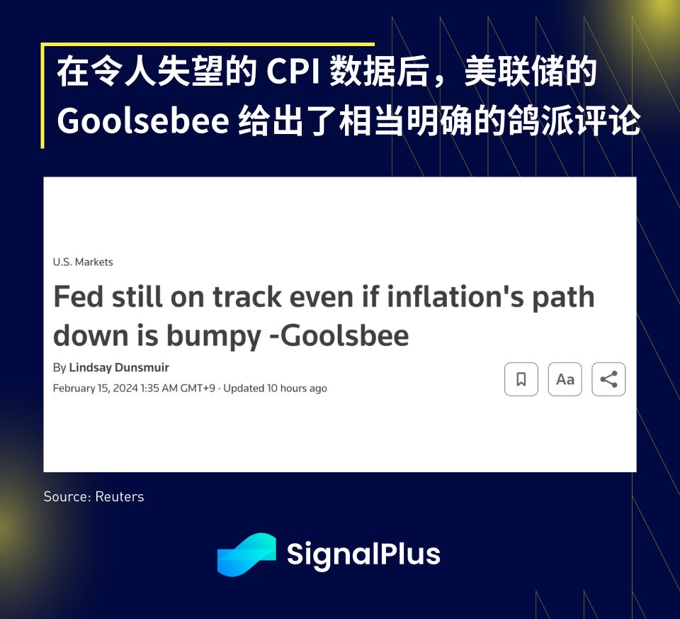 此外,美聯儲Goolsbee 意外發表了相當直接和鴿派的評論,稱市場“不應因一個月的CPI 數據而激動”,且“只是一個月的數據,不是幾個月”,他還表示,美聯儲的 通膨目標是基於PCE 而非CPI,並且“通膨率已經連續6 到7 個月往目標接近”,這種明確的鴿派態度與週二Powell 與立法機構的閉門會議形成了鮮明對比,Powell 在會議 上表示,低收入工作者的薪資成長一直高於通膨,“而現在對大多數工作者來說越來越是如此”,針對超出預期的CPI,Powell 重申通膨數據“符合他們先前的預期 ”,美聯儲將依賴即將發布的PCE 報告來提供“更多情報”,同時他拒絕給出任何關於美聯儲何時降息的線索。