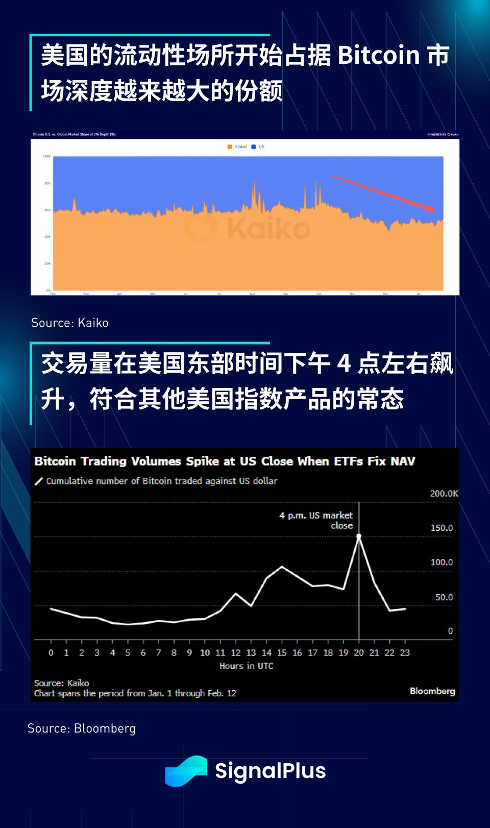 然而,我們之前提到過,在焦點轉向 (TradFi) ETF 的同時,權力的平衡似乎也稍微轉回西方。 根據 Kaiko 的數據,美國交易場所在 Bitcoin 市場深度中的佔比越來越大。 此外,與我們在傳統指數交易活動中看到的情況類似,交易量在ETF 發行方記帳的「EST 下午4 點結算價」 期間激增,預計隨著更多美國ETF 產品的推出,這種行為 將持續。 隨著虛擬資產未來進一步製度化,這種「權力更迭」的趨勢值得我們持續關注。