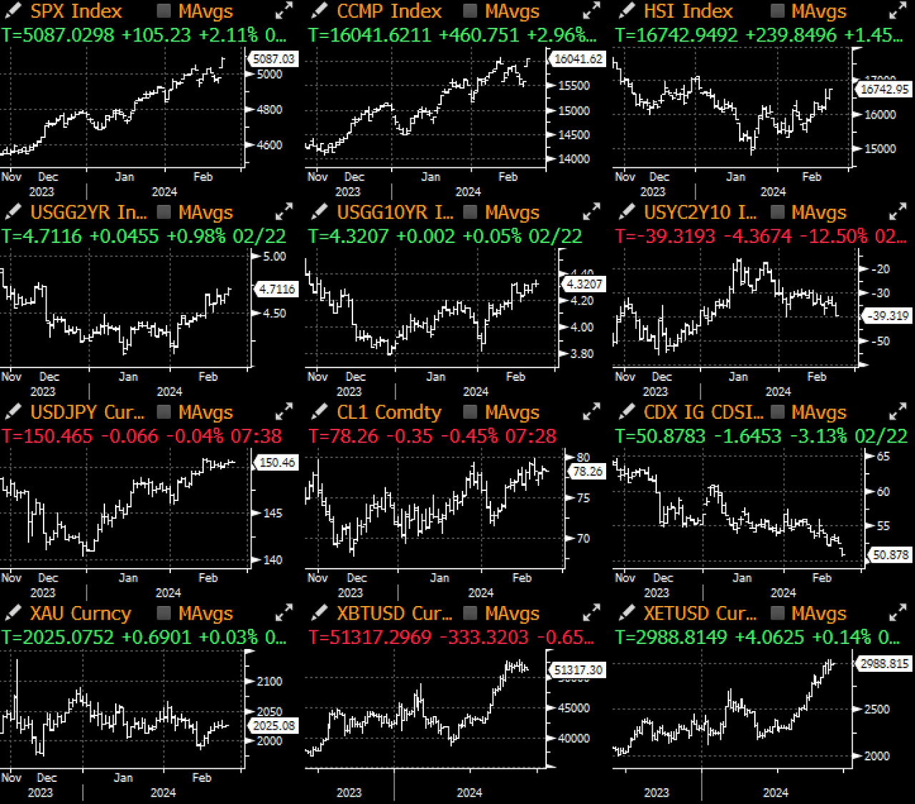 美國經濟仍處於良好狀態(昨天公佈的初請失業救濟人數和PMI 仍然強勁),金融形勢已經大幅放鬆,美國大型上市公司仍在賺錢,加上生成式AI 帶來顯著的財富效應以及未來生產力提升 的期望,聯準會接下來是否會被迫採取較為鷹派的立場? 或者我們進入了股市「立基於永恆的高地」(Fisher 1929)或「非理性繁榮」的時期(Greenspan 1996)? 無論哪種情況,「高利率維持更長時間」的敘事應該都會回歸,股債相關性可能會在短期內保持脫鉤狀態。