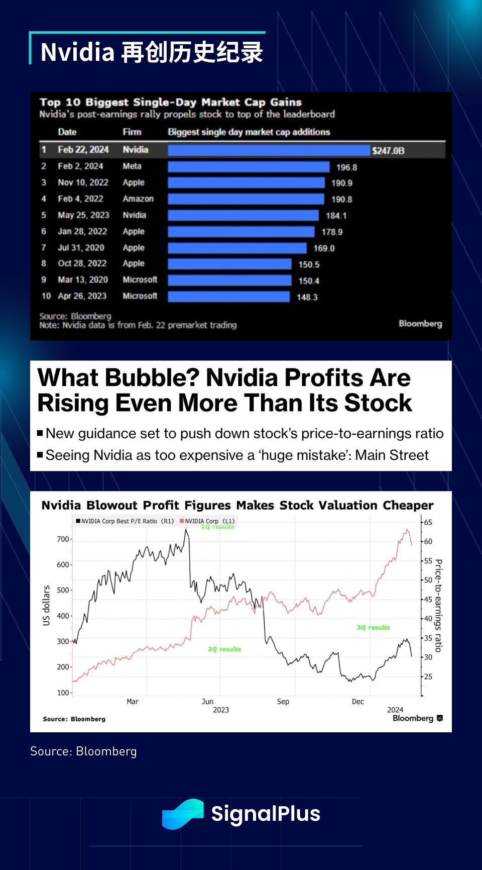 一如預期,風險市場大幅上漲,Nvidia 爆炸性的盈利結果帶動股市創下新高,這家AI 巨頭昨天市值暴增$ 2, 470 億美元,創下市值最大單日漲幅的紀錄,超過了Meta 在本月稍 早達成的$ 1, 970 億美元;此外,主流分析師和媒體已開始為該股的歷史性漲勢辯護,聲稱EPS 的增長導致本益比被壓縮(遠期本益比「僅」 35 倍)。