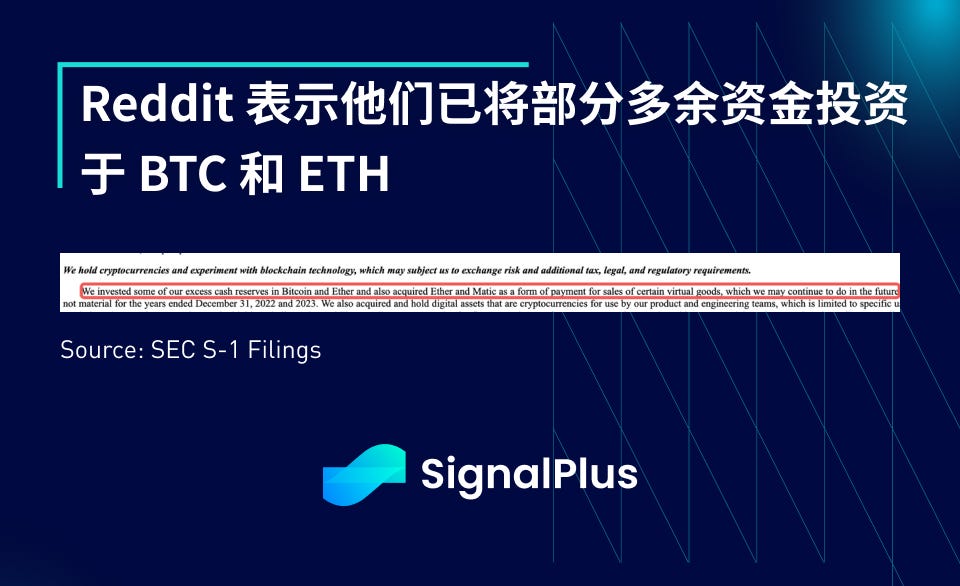在加密货币方面,价格在近期反弹后也同样趋于平稳,不过整体主流叙事仍持续改善。Reddit 最近在其 S-1 (IPO) 文件中宣布,他们已将部分多余现金投资于 BTC 和 ETH,且预计未来会继续使用它们来支付某些虚拟商品。
