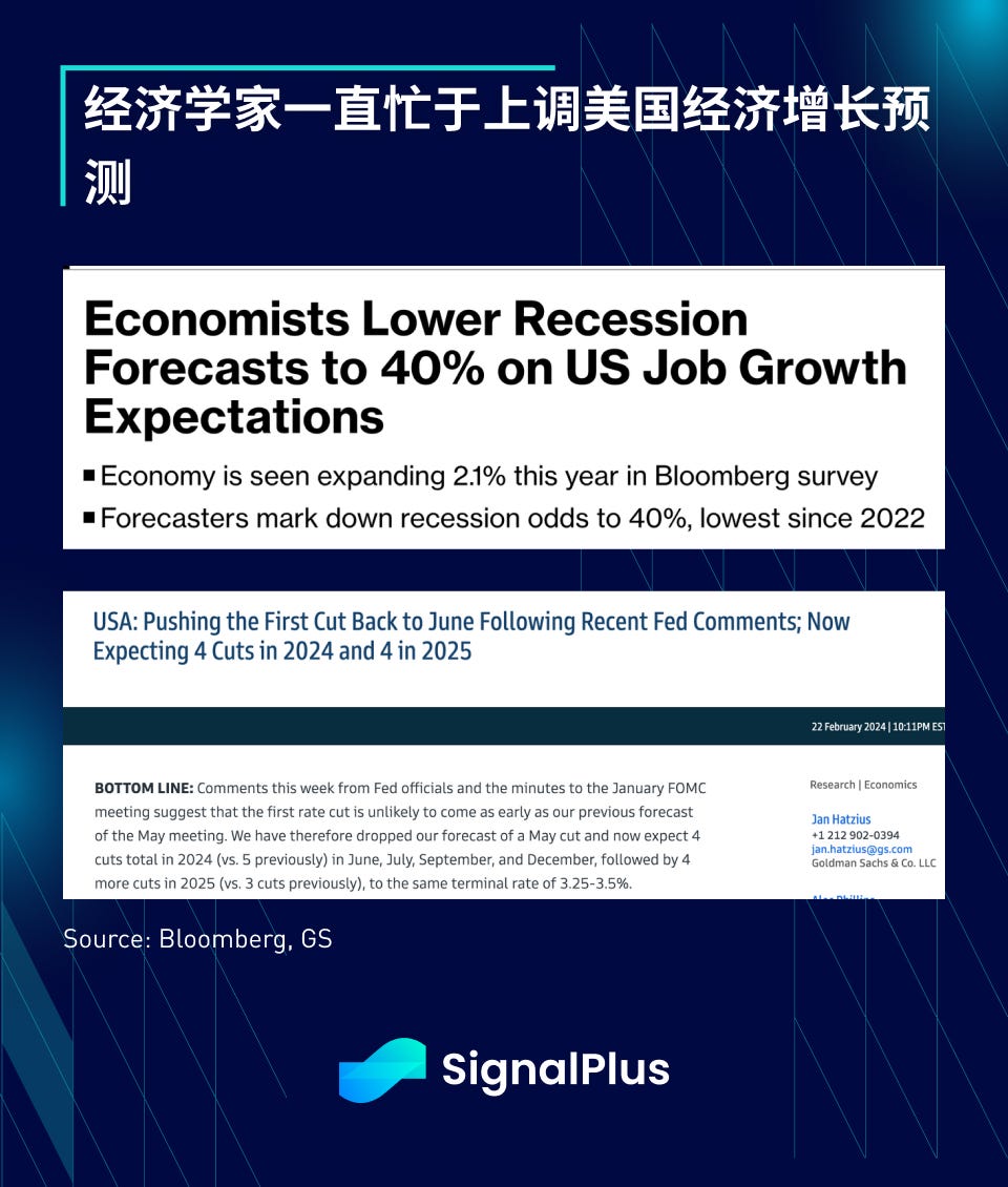 賣方經濟學家也一直在上修美國經濟成長預測,普遍認為經濟衰退的可能性已經降至不到 40% , 2024 年經濟成長預測的中位數為 2.1% 。 此外,由於經濟數據強勁,高盛也正式將聯準會首次降息的預測推遲至 6 月,不過他們仍預計終端利率將降至 3.25–3.5% 左右的低點。