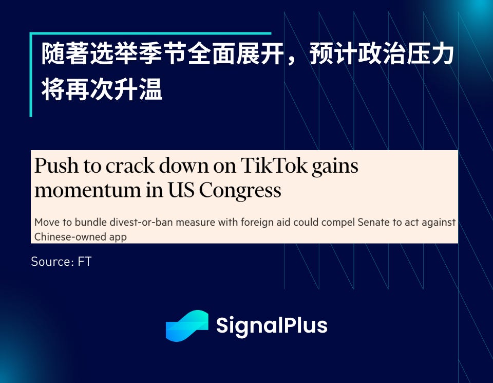 在政治方面,美國準備提高中國鋼鐵進口的關稅,同時實施一些其他的新限制,另外 TikTok 法案在國會也取得了顯著的進展。