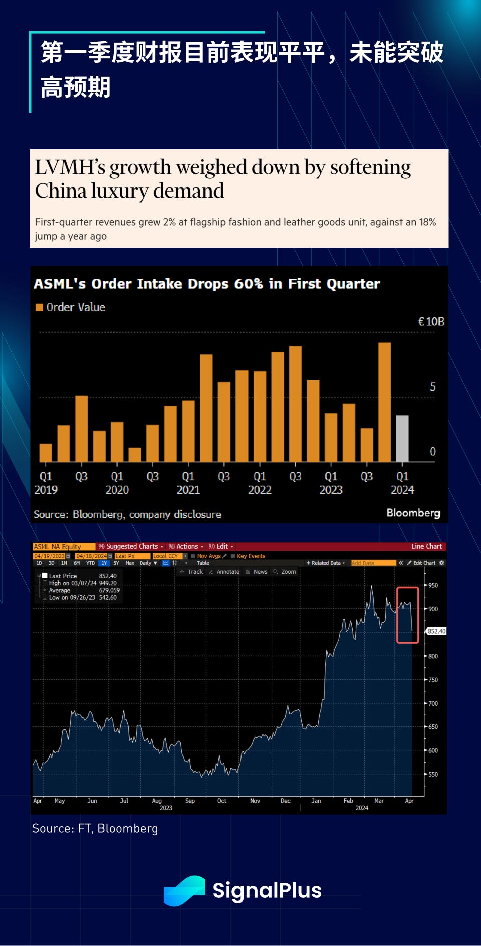在企業財報方面,開局表現平平,銀行業獲利情況憂喜參半(JPM 未達預期,高盛則優於預期),而 LVMH 集團的銷售額因中國奢侈品購買量低迷而未能達到預期。 在科技股方面,荷蘭巨頭ASML 第一季的訂單下降61% 至36 億歐元,遠低於預期的46 億歐元,而由於全球半導體製造產能提高,庫存水平較高,台積電和三星的新訂單放 緩,導致業績疲軟。