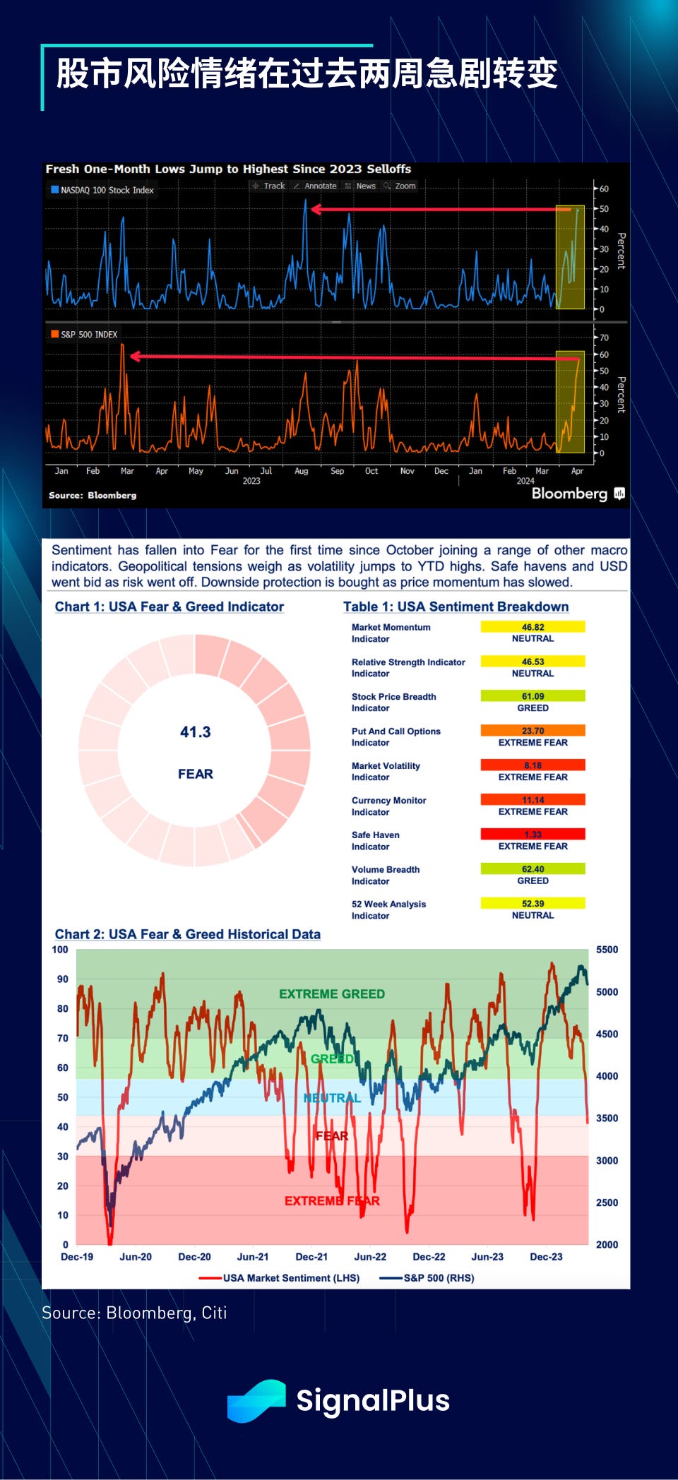 目前價格可能完全受到技術面和部位的驅動,從不同的情緒指標可以看出,近期的下跌已經造成了重大的技術面損害,不過同時也有機會出現超賣反彈。 價格觸及一個月低點的 Nasdaq 和 SPX 股票數量已經達到近一年來的新高,花旗 proprietary sentiment barometer 情緒指標在最近的下跌後轉向「恐懼」區域。