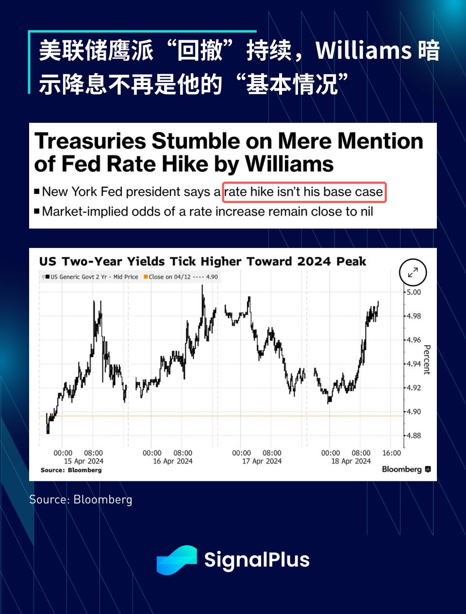 然而,就在站稳脚跟一天后,美债再次受到重击,纽约联储主席 Williams 暗示降息不再是他的“基本情况”,并表示利率处于“良好位置”,且“我不觉得降息有什么迫切性”。收益率全面跃升 5–6 个基点, 2 年期收益率再次接近今年高点 5% 左右。