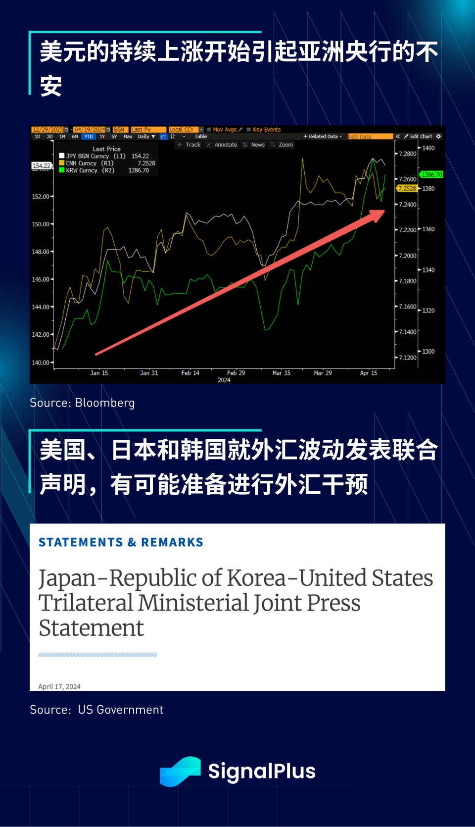 美债收益率和美元指数的大幅上涨促使美国财政部长 Yellen、日本财务大臣 Suzuki 和韩国财政部长 Choi Sang-mok 发表联合声明,表示三国将“继续就外汇市场发展进行密切磋商,符合现有的 G-20 承诺”,同时承认日本和韩国对日圆和韩元近期大幅贬值感到担忧,这表示若趋势持续,亚洲地区的央行可能会进行外汇干预。Reuters 随后报导了进一步的消息,日本财务大臣 Suzuki 表示,“G 7 确认其对汇率过度变动的承诺,防止对经济产生负面影响”是有意义的,看来,消息面带来的交易风险将会回归一段时间。