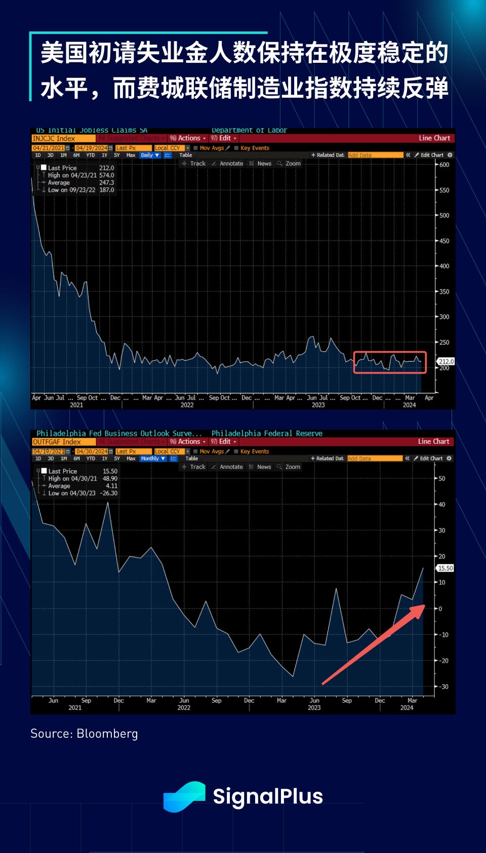 美国市场开局平稳,地缘政治紧张局势和负面情绪似乎正迅速瓦解,初请失业金人数保持在极度稳定的水平(6 周中有 5 周维持在 21 万左右),美国费城联储制造业指数攀升至 2022 年 4 月以来的最高水平(由新订单 + 12.2 和支付价格 + 23 所推动)。