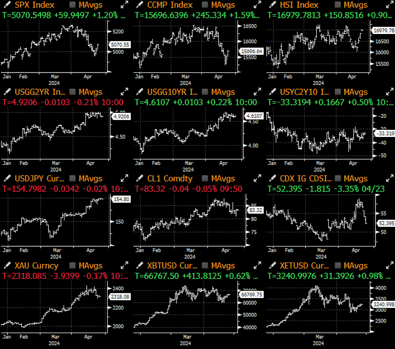 美債隨之反彈, 2 年期殖利率出現牛陡走勢,從 5% 左右回落至 4.92% 。 美元也隨之走軟,歐元兌美元來到 1.07 上方,美元兌日圓則維持在 154.85 下方。 疲軟的經濟數據重新點燃降息的希望,科技股領漲股市反彈,科技股漲幅達 1.5% 。