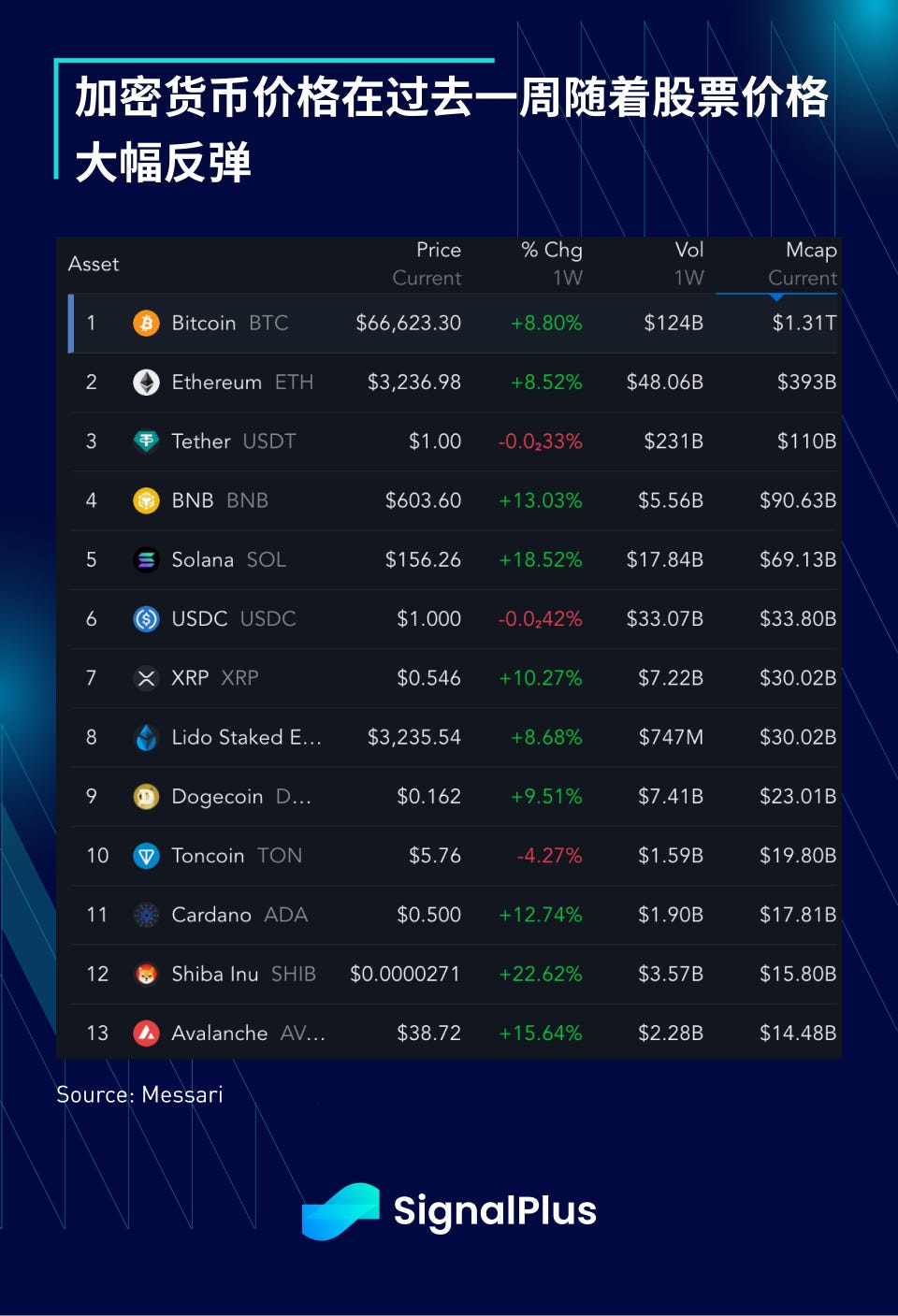 加密貨幣價格保持強勁,BTC 再次逼近 6.7 萬美元,altcoins 在過去一周反彈 10–20% 。 雖然有些人可能將減半視為驅動市場的主要正面因素,但我們認為價格多次跌至 6 萬水平已經清除了大量短期多頭,使得當前的空頭擠壓加劇。 預計未來幾天內,價格將反映股市情緒的復甦,一直到 PCE 數據發布,屆時若數據走弱,可能會成為 BTC 拉回 7 萬美元以上的催化劑,希望好運降臨!