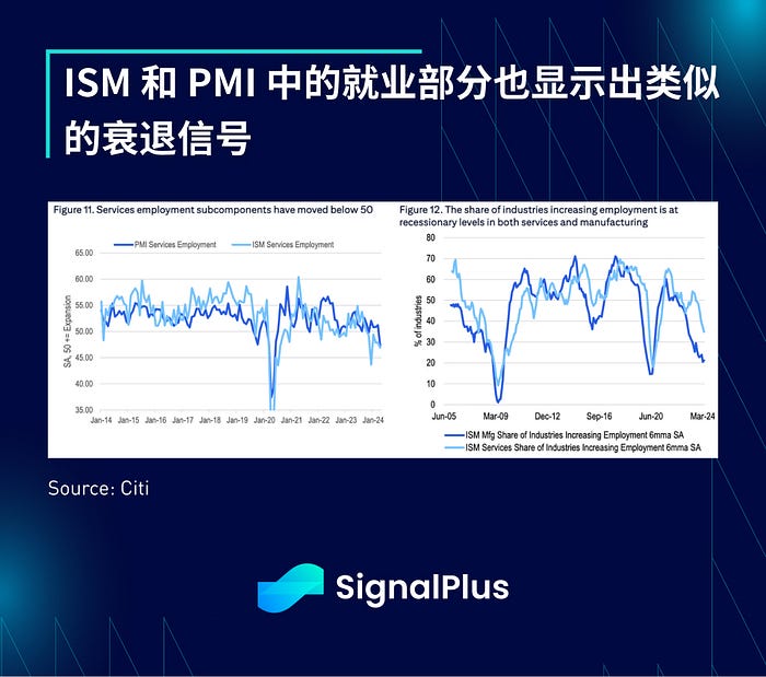 此外,小型企業的招聘趨勢明顯減弱,ISM 和 PMI 中的就業部分均表現疲軟,正在進行招聘的服務業和製造業企業比例下降至通常在經濟衰退時才出現的水平。
