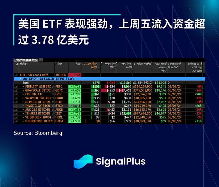 加密貨幣與宏觀情緒的相關性越來越強,隨著市場情緒重新轉向寬鬆的美聯儲/遠期利率走低/股市走強,儘管黃金現貨表現疲軟,上週五加密貨幣價格出現大幅反彈,週末BTC 現貨 價格突破6.4 萬美元。 上週五美國 ETF 流入強勁,達 3.78 億美元,甚至連 Grayscale 也出現了 6, 300 萬美元的資金流入。 在當前宏觀環境下,我們維持風險報酬變得更加中性的看法,預期短期的價格回檔更有利於逢低買進。