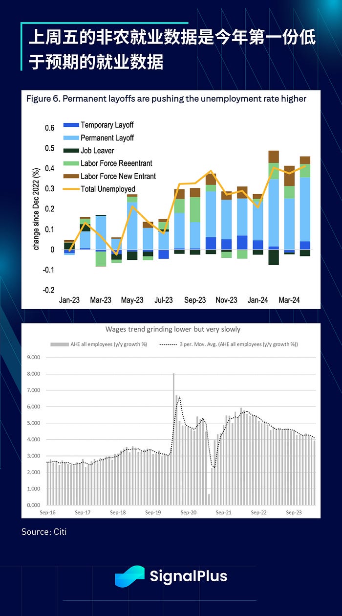 就業數據今年首度低於預期(沒有意外走高),整體就業人口變動 + 17.5 萬(先前的平均增量約為 27.5 萬左右),失業率也意外從 3.83% 上升至 3.87% 。