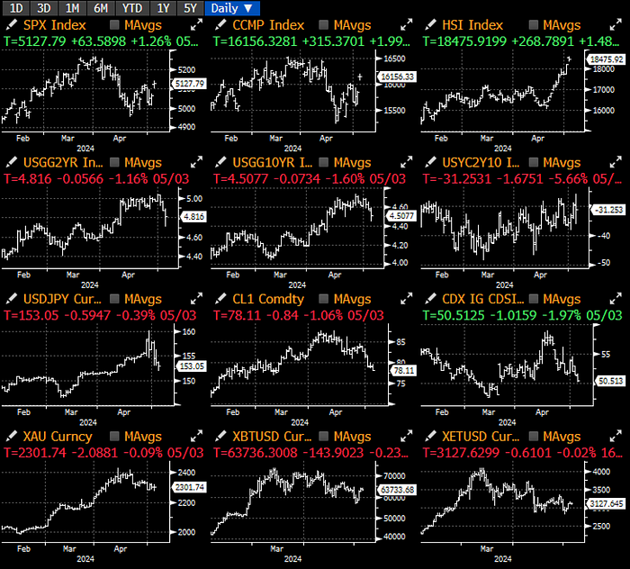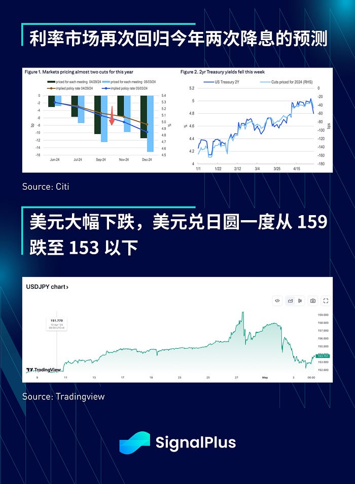 殖利率出現牛陡走勢, 2 年期殖利率從 5% 回落至 4.8% , 10 年期殖利率回到 4.5% ,市場定價再度預測今年有近 2 次降息。 股市方面,科技股上漲 2% ,SPX 收在 5, 100 點上方,美元兌日圓在 48 小時內從上周高點 159 跌至 152.5 。 總而言之,市場情緒受到鴿派利率背景的提振,以強勁的風險反彈結束上週。