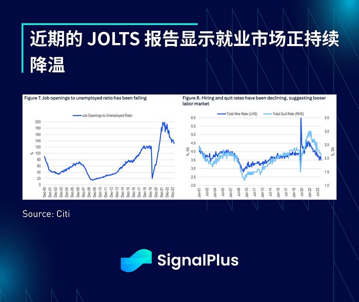 其他較高頻率的就業市場指標也開始顯示放緩跡象,例如近期的 JOLTS 報告顯示職缺與失業人口比率降低,以及私部門招聘和離職率處於多年來低點。