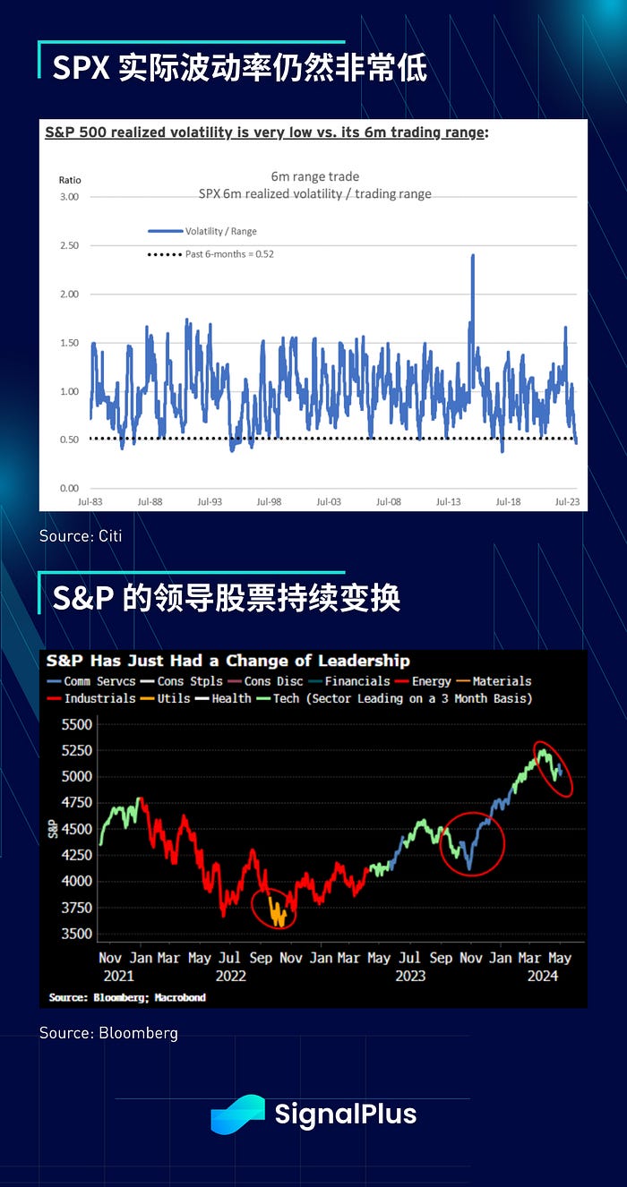 本週宏觀數據將相對清淡,聯準會官員的發言可能會比數據本身來得重要,中國將發布貨幣供給/融資數據,而美國將有Barkin、Williams、Kashkari、Jerrferson、Collins、Cook 以及Bowman 等輪流發表 政策意見。 經過幾週的風險清洗,市場部位相較於 3 月應該更加乾淨,風險情緒可能已經找到近期底部,至少在數據開始隱含更多「硬著陸」風險前會是如此。 隨著投資者持續調整投資組合而不是直接拋售股票,SPX 的實際波動率仍然非常低,Bloomberg 報導稱,在當前的調整期間,SPX 的領導股票發生變化,雖然比較像是在’magnificient 7 ‘ 中 輪流替換。 預計風險資產有機會從這裡開始緩慢爬升。