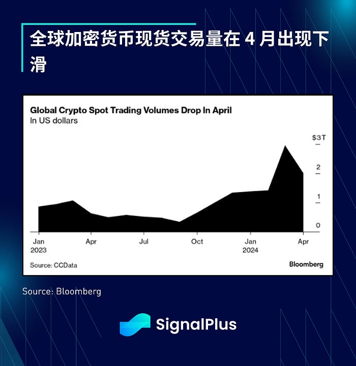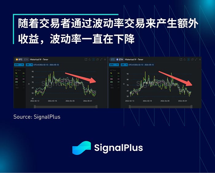 加密貨幣價格走勢則令人失望,上週五紐約交易時段BTC 從63.5 k 大幅回調至60.5 k,ETF 小幅流出8, 500 萬,而全球主要的CEX 報告稱4 月現貨交易量下降,為約5 個月來的首次下滑。 隨著現貨價格在過去 1–2 個月大部分時間都處於盤整,價格走勢顯得沉重,而現有投資者自然仍傾向多頭。 此外,隨著趨勢交易者賣出買權以獲取額外收入,長期參與者則重新開始利用波動率在當前情緒低迷時期產生收益,隱含波動率大幅下降。