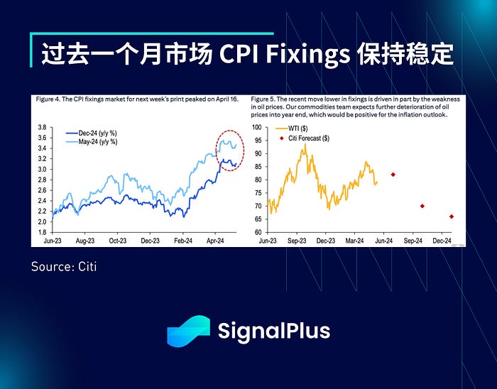 市場焦點將集中在本週三的 CPI 數據上,該數據可能會成為中期價格走勢的關鍵驅動因素。 雖然市場的確希望通膨數據走低,以引導通膨放緩的敘事重新回歸,但近期市場主導的CPI fixing 一直相當穩定,交易員預期5 月份CPI 同比增長約3.4% , 12 月可能進一步放緩至3.1% 左右。 短期內金融情勢的寬鬆會與消費者信貸需求的疲軟相互抵消,而油價走勢可能會推動年底前的通膨趨勢和預期。