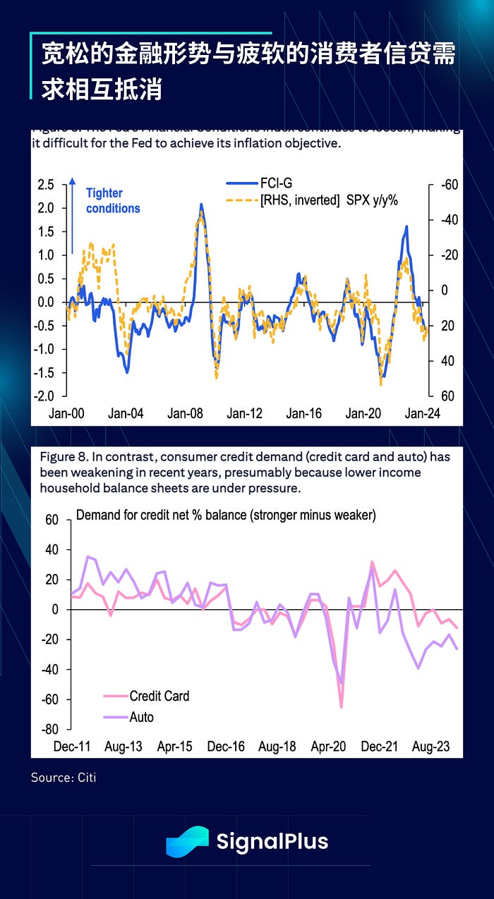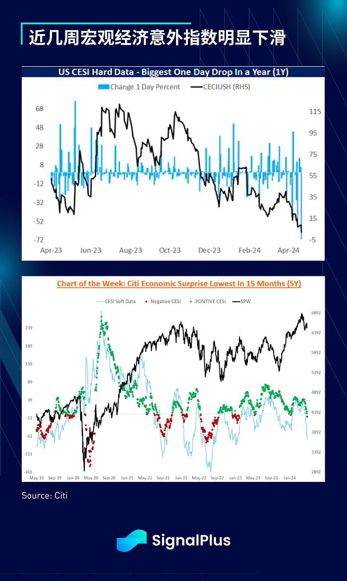 整體而言,宏觀經濟意外指數已跌至 1.5 年來的最低水平,花旗的硬數據指標在上週出現了 1 年來最大單日跌幅。 雖然目前斷言「硬著陸」還為時過早,但隨著消費者儲蓄下降、PMI 持續低迷、高利率拖累信貸需求、加上終於放緩的就業市場,美國消費者確實開始進入一個疲軟的階段 。