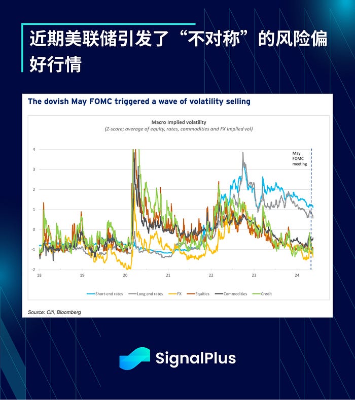 過去一周,成長經濟長放緩和通膨預期下滑再次引發了軟著陸的敘事,這不是我們第一次看到這種情況,這時候市場最自然的反應就是股票的FOMO 情緒、買入信用工具 、收取固定利率、做空波動率、並賺取套利收益,這幾乎是自上次FOMC 會議以來的標準劇本,且在沒有任何顯著變數的情況下,這一趨勢沒有放緩的跡象。