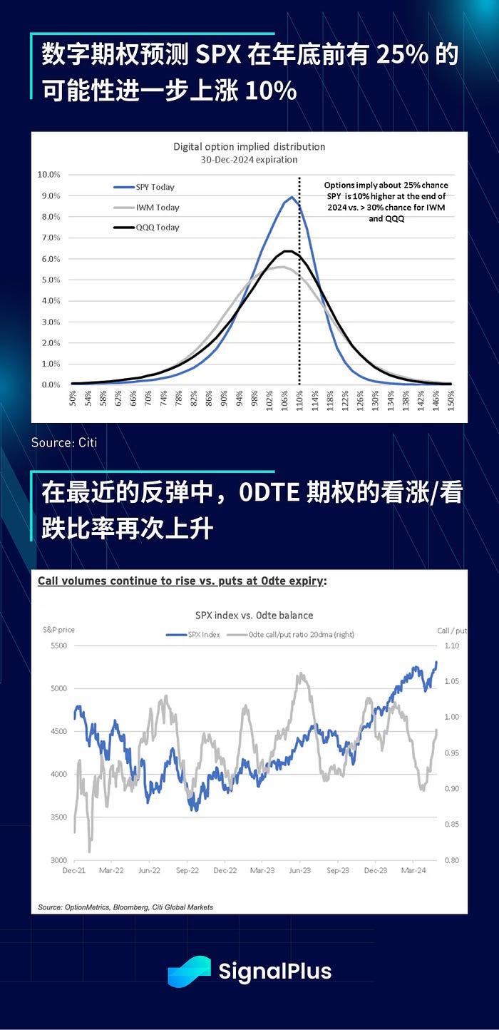 股票期權資金流也指向同一方向,二元期權(數位期權)定價反映 SPX 年底前有 25% 的可能性進一步上漲 10% 。 此外,在這波反彈中, 0 DTE 選擇權的買權/賣權比率再次上升,約 56% 的交易量流向買權。
