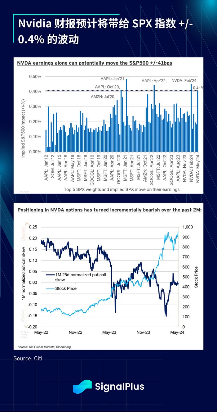 本周在 Nvidia 公布财报之前没有太多值得关注的数据,然后在 6 月前两周的非农就业数据和 FOMC + CPI 之前,数据方面又会再次进入假期模式。根据 Nvidia 在 SPX 指数中的权重以及 Nvidia 期权隐含的波动,该公司在财报日对 SPX 指数的影响为 +/- 0.4% ,而该股的头寸似乎已经不像年初时那么集中。