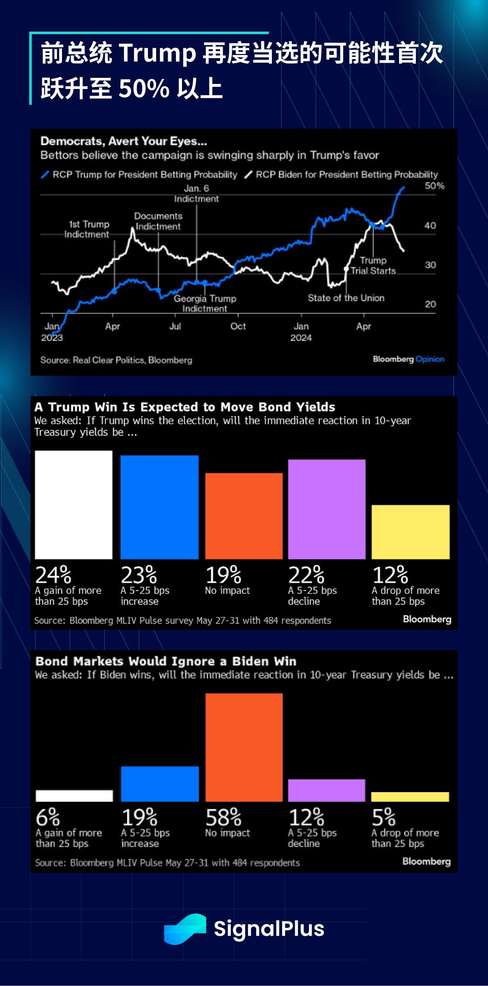 在大选方面,前总统 Trump 从最近的有罪判决中受益匪浅,他赢得 11 月大选的可能性跃升至 50% 以上(相比于 Biden 的 35% ),看来有相当一部分的选民认为这是对 Trump 的“政治迫害”,反而对 Trump 有利。如果这位前总统再次当选,主要的影响将会是固定收益,因为市场普遍预期他会对美联储施加新的政治影响,推行宽松的货币政策、自由支出的财政政策以及进一步减税,至少对市场来说,第四季度肯定会非常有趣。