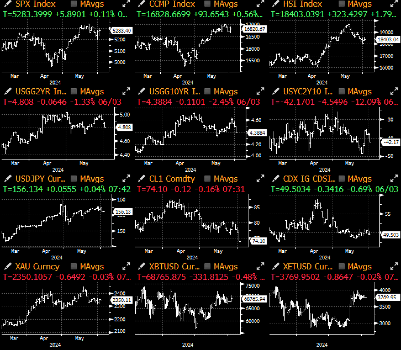由于上周五 PCE 出现连续减速、石油期货下跌 10% 以及人们对经济在理想情况下放缓的期待,宏观资产在过去几个交易日大幅反弹。本周将会有一连串重要数据发布,包括今天的 JOLTS、周三的 ADP 和 ISM 服务业指数以及周五的非农就业数据。