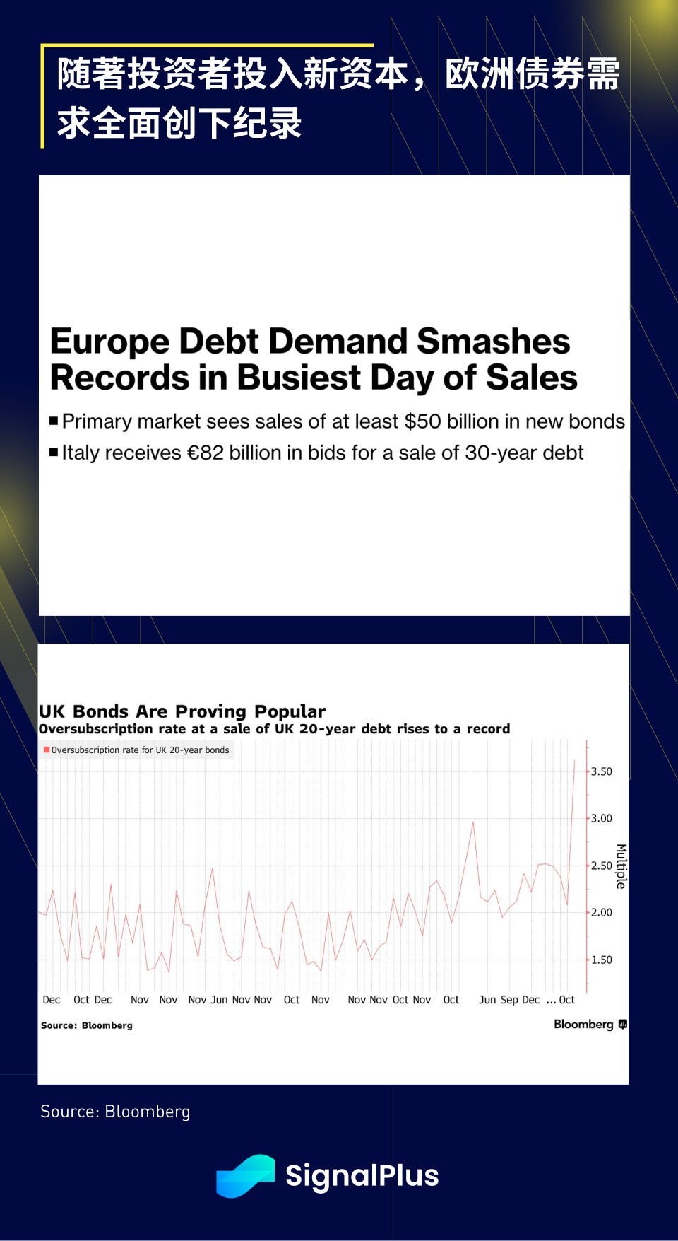 債券發行人抓住經濟數據和市場活動的短暫平靜期,繼續發行熱潮,歐洲債券供應創歷史新高,SSA、金融機構和企業共發行超過500 億的新債,隨著投資者在新的一年 積極投入新資金,債券的需求也異常旺盛,比利時70 億歐元的10 年期債券發行出現720 億歐元的投標金額(10 倍),英國22.5 億英鎊的20 年期債券發行也出現80 億英鎊的 買盤(3.6 倍),義大利7 年期和30 年期債券需求也超過發行量的7 倍,同時荷蘭(6 年期)和奧地利(9 和30 年期)的債券發行也獲得投資者的 積極響應。