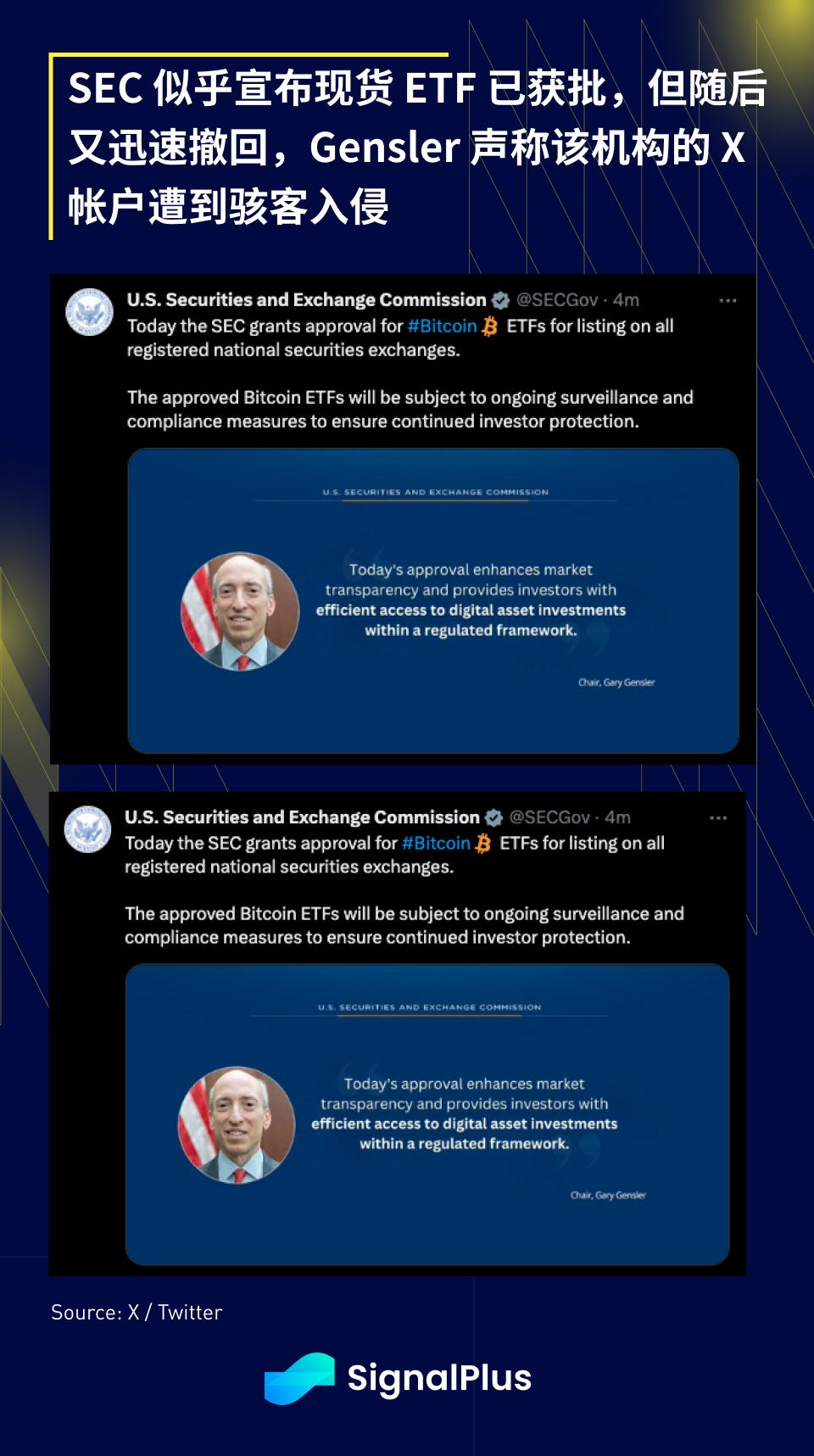 加密貨幣市場相較於TradFi 市場更為活躍,紐約交易時段接近尾盤時,BTC 出現一系列動盪和混亂,SEC 的官方X 帳戶似乎宣布現貨ETF 已獲批上市,並附上Gary Gensler 的發言, 然而,該推文在一小時內就被刪除,隨後主席本人發表聲明澄清,稱SEC 官方帳戶遭到駭客入侵,先前的推文並非事實。
