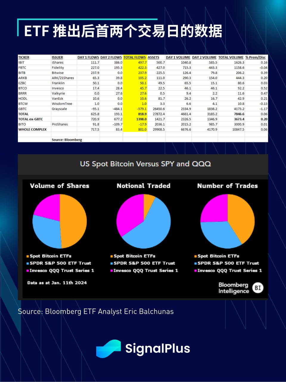 在加密貨幣方面,Bloomberg ETF 分析師Eric Balchunas 指出,ETF 核准後的前兩個交易日吸引了超過14 億美元的新資金流入新ETF,不過被GBTC 5.79 億美元的資金流出所部分抵銷, 與SPY 和QQQ 等領先產品相比,加密貨幣ETF 的交易量和交易筆數表現相當亮眼,特別是考慮到過去18 個月這個資產類別被主流大眾嚴重批評。