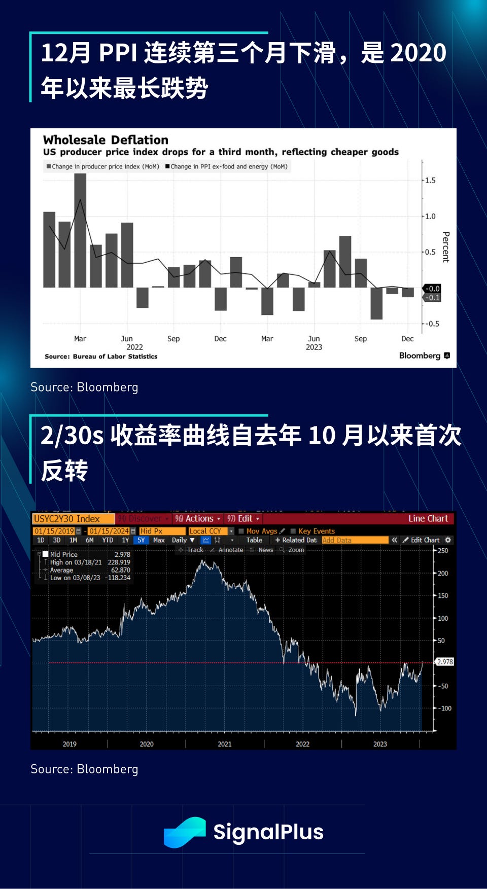 上週五公佈的美國PPI 走軟,為美聯儲的鴿派轉向背書,並使未來進一步降息的可能性增加,前值下修加上核心PPI 的下滑(下滑至同比增長1.8% )導致10 年期收益 率盤中下跌10 個基點, 2/10 s 走陡回到「僅」-20 個基點的利差,且2/30 s 曲線自去年10 月以來第一次出現反轉,短天期收益率 也受惠於地緣政治緊張局勢,美國/英國聯合對Houthin 叛軍進行空襲,導緻原油價格一度上漲4% ,聯邦基金利率反映的2024 年降息幅度來到165 個基點,是今年的新紀錄。