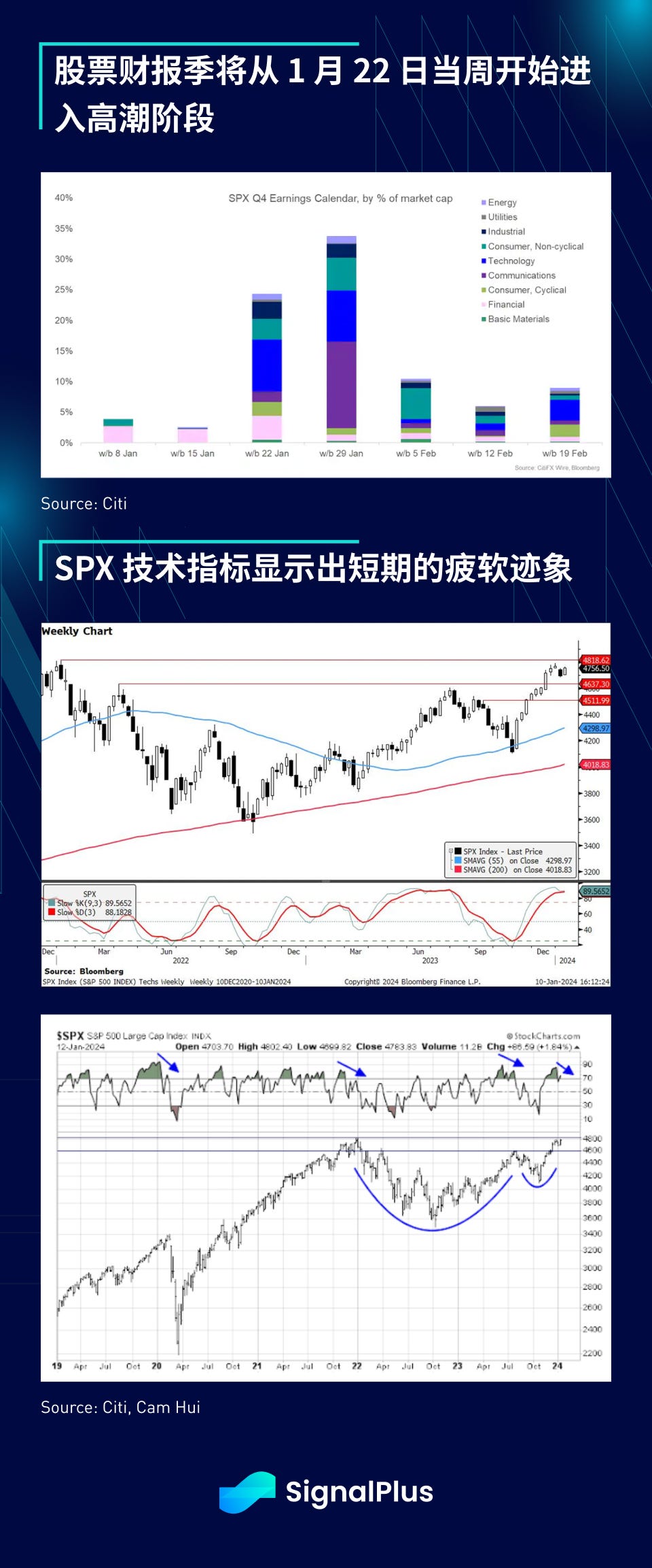 在股市方面,焦點將放在財報季,將在22 日和29 日這兩週內發布第四季度業績的SPX 企業佔總市值的50% 以上;從技術面來看,在近期的走勢之後, 大盤出現了一些早期疲軟跡象,不過我們正在接近SPX 的歷史高點4818 ,如果突破該水平,漲勢有機會進一步延續。