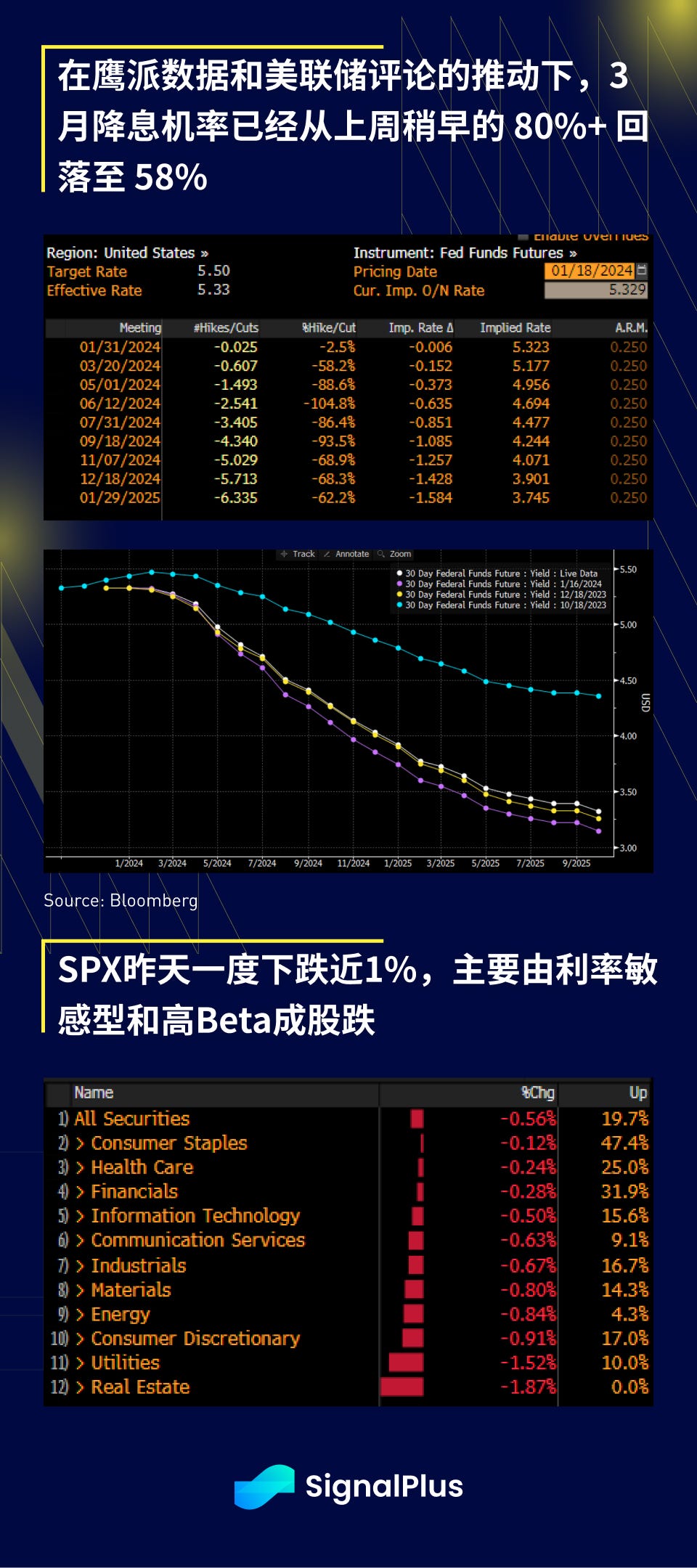 上述因素共同推動2 年期美債殖利率上升13 個基點,而130 億美元的20 年期美債增額發行結果也不甚理想,尾部為0.9 個基點,投標倍數為2.53 ;SPX 跌幅一度來 到1% ,主要受到利率敏感型板塊(房地產-2% 、公用事業-1.5% )以及高beta 成長股(當日回撤2.4% )的拖累, 3 月降息機率已回落至58% 左右,上週 一度高達80% 以上。