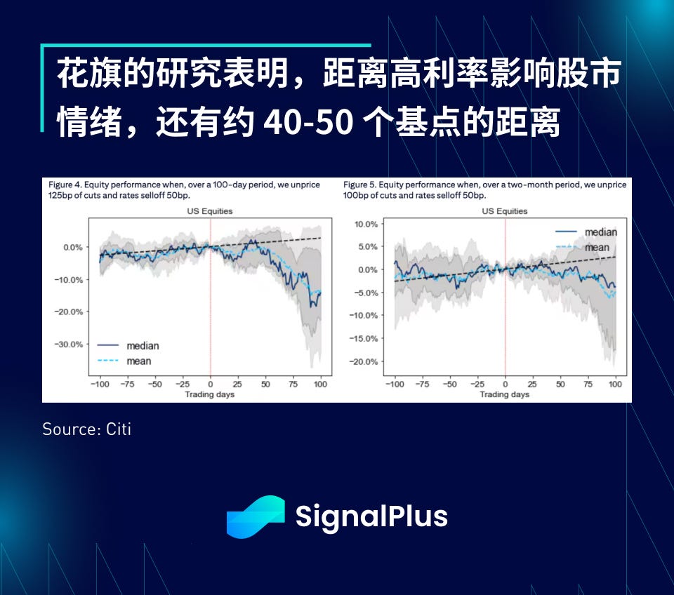 關於利率何時會對股票產生影響這一重要問題,花旗進行了分析,他們研究了先前的「鷹派」情景並得出結論,認為我們距離當前的利率變動對股市產生負面影響還有一段距離 (~ 40–50 個基點)。 投資者也認為這種情況極不可能發生,他們確信聯準會將在強勁的成長和通膨中保持鴿派傾向,因此無法想像他們會完全排除所有隱含的降息,因此,投資者選擇繼續關注企業獲 利(即將到來)、經濟成長(強勁)以及聯準會的友善評論,以支持股市情緒持續走高。 從目前的情況看來,只要目前的經濟軌跡保持不變,實際降息只不過是額外的利多。