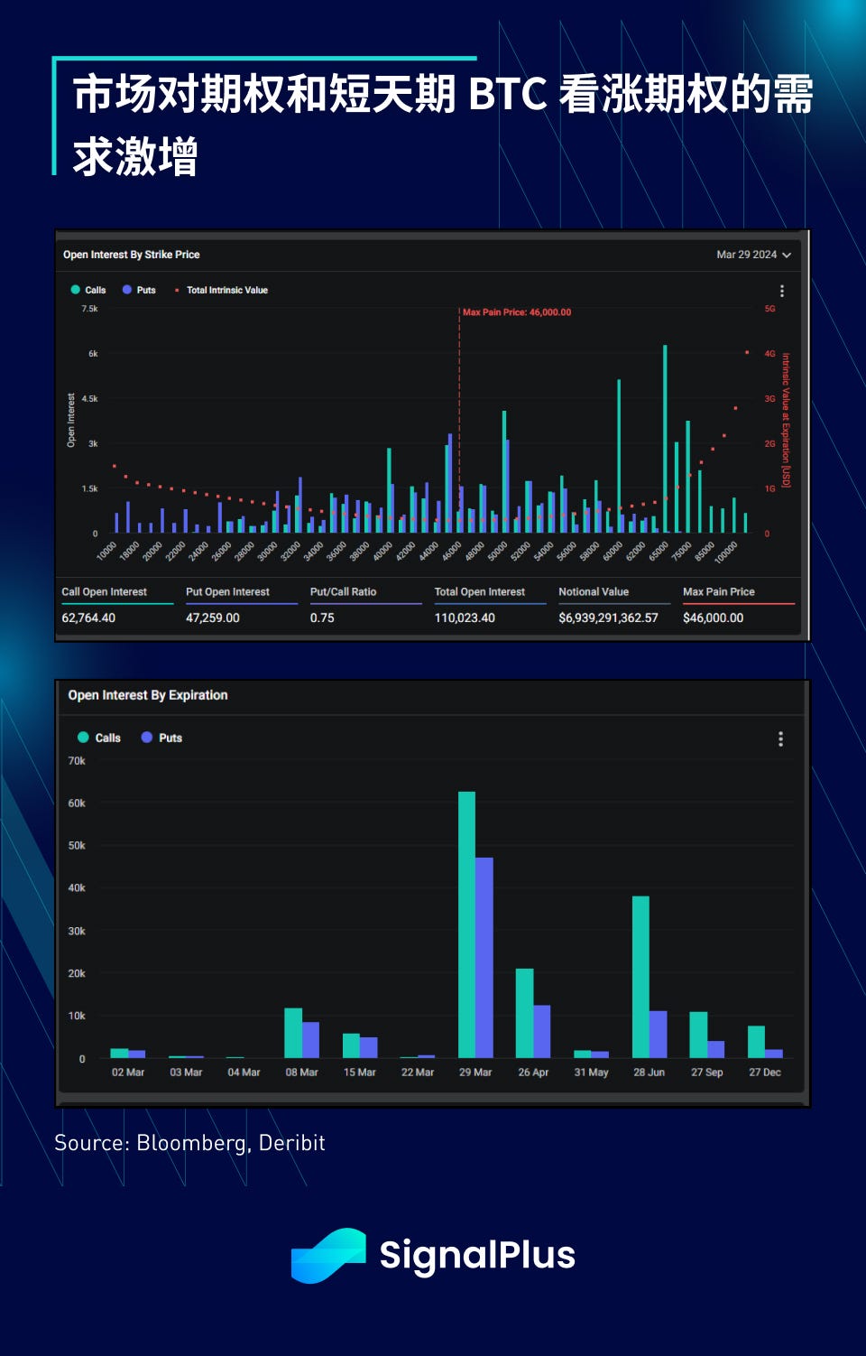在期权方面,短天期期权需求激增,未平仓量集中在 6.5 至 7.5 万美元的水平附近。期权交易所 Deribit 上周公布了创纪录的交易量, 24 小时交易量超过 124 亿美元,未平仓量超过 270 亿美元。市场对短天期看涨期权的巨大兴趣正在推高隐含波动率,并导致期权卖方出现小型 gamma 挤压,其中大部分敞口将于 3 月 29 日到期,因此预计本月大部分时间里价格将反复波动(上下震荡),享受上涨的同时请务必谨慎管理风险。