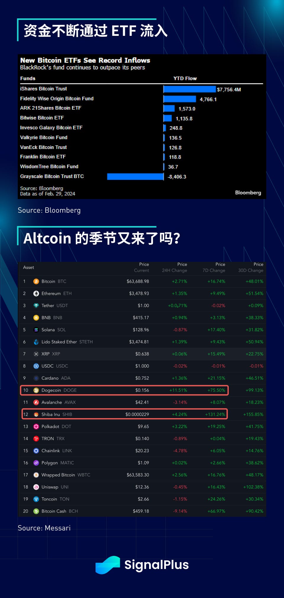 在加密货币方面,创纪录的资金仍不断通过 ETF 流入,正面的市场情绪似乎也蔓延到了 altcoins 以及 memecoin, SOL (+ 17% )、XPR (+ 16% )、Cardano (+ 21% ) 、Polkadot (+ 19% )、Doge (+ 7% ) 和 Shiba (+ 131% ) 在过去 7 天都在加速上涨。