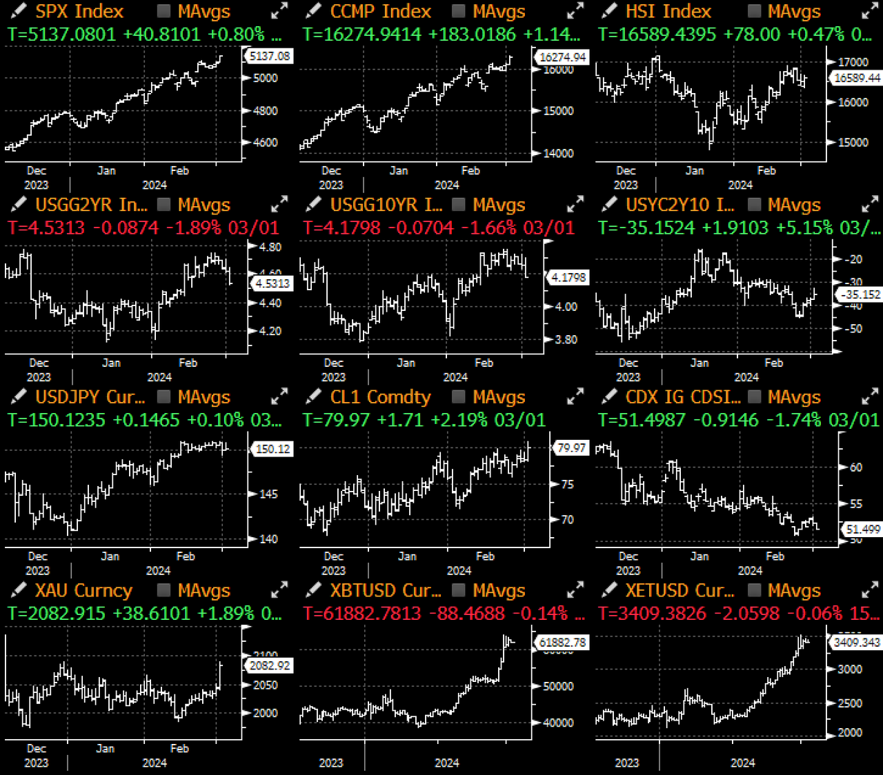 美国经济衰退遥遥无期(亚特兰大联储预估第一季度 GDP 增长约 3% ),美国消费者仍相当强劲(美国银行提到 2 月份消费者支出增长超过 3% ),就业/薪资/通胀增长保持稳定,Apollo 的首席经济学家表示,由于央行将在 2024 年大部分时间里应对通胀并保持高收益率,美联储将不会在 2024 年降息。Slok 指出,美国增长预期大幅上升,就业市场依然紧绷,核心通胀居高不下,加上金融形势过于宽松,这些因素会共同抑制宽松预期,此外,美联储从 2023 年第四季度开始的口头政策转向已经为资产价格提供了足够的推动力。
