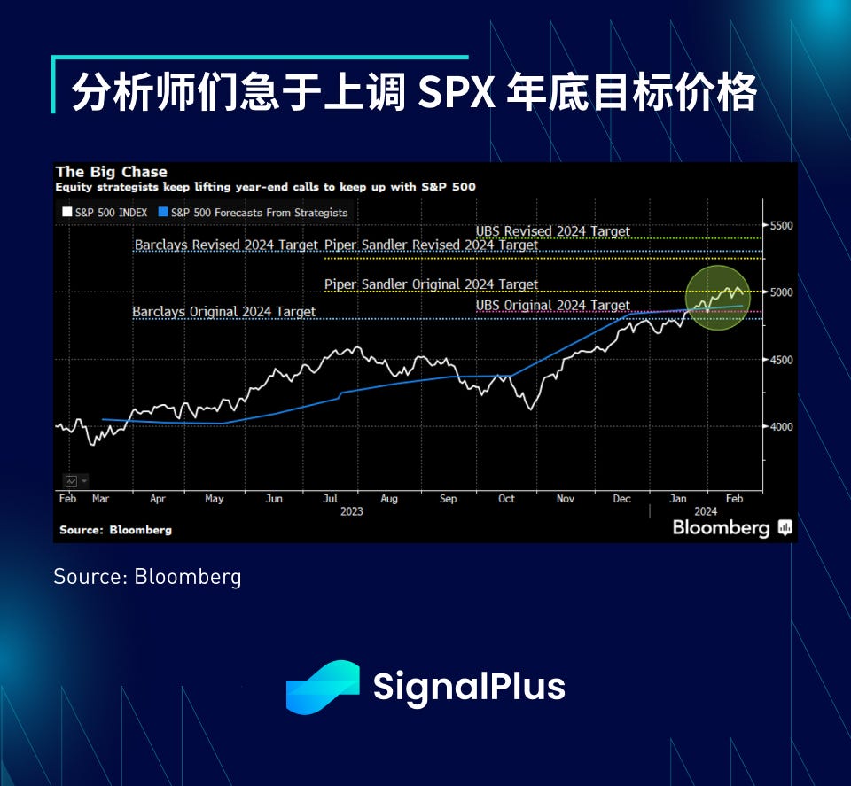 Powell 主席将于 3 月 7 日向参议院银行委员会提供半年度货币政策更新,届时他将有机会讨论近期美国通胀数据的反弹,并就 12 月鸽派转向的理由接受质询。此外,财报季已经过去,企业盈利可观,也已反映在股票价格中,根据 Bloomberg,SPX 盈利超出季前预测的幅度有机会成为 2021 年第四季度以来最大。不断增长的盈利无疑让华尔街措手不及,策略分析师们急忙上调 SPX 年终目标,仅在过去两周内媒体就报导了超过六次的预测上调。