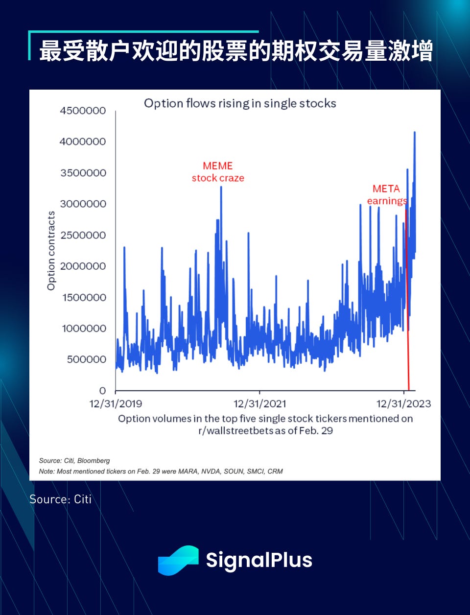 与加密货币类似,散户交易活动激增,个股期权的交易量不断增加,甚至远超过 2021 年的高点,且在 NVDA 和 META 的正向盈利结果后进一步加速。